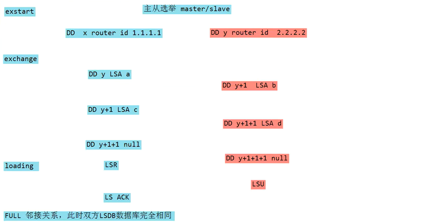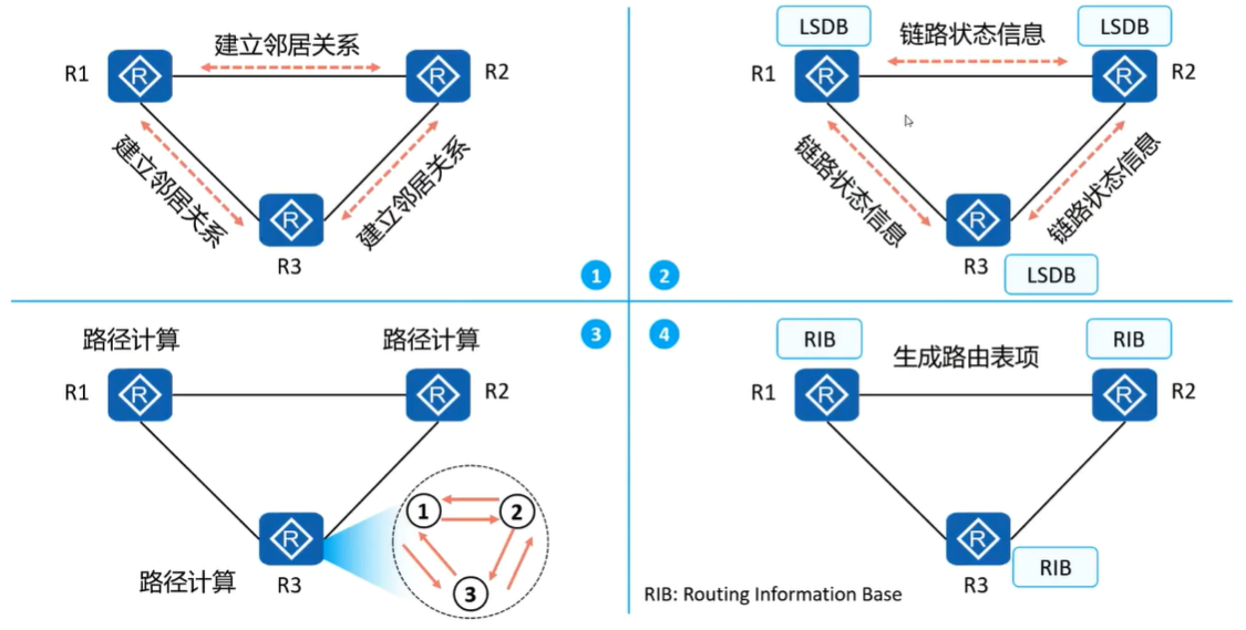 OSPF完成邻接关系的建立有四个步骤,建立邻居关系、协商主/从、交互LSDB信息,同步LSDB。