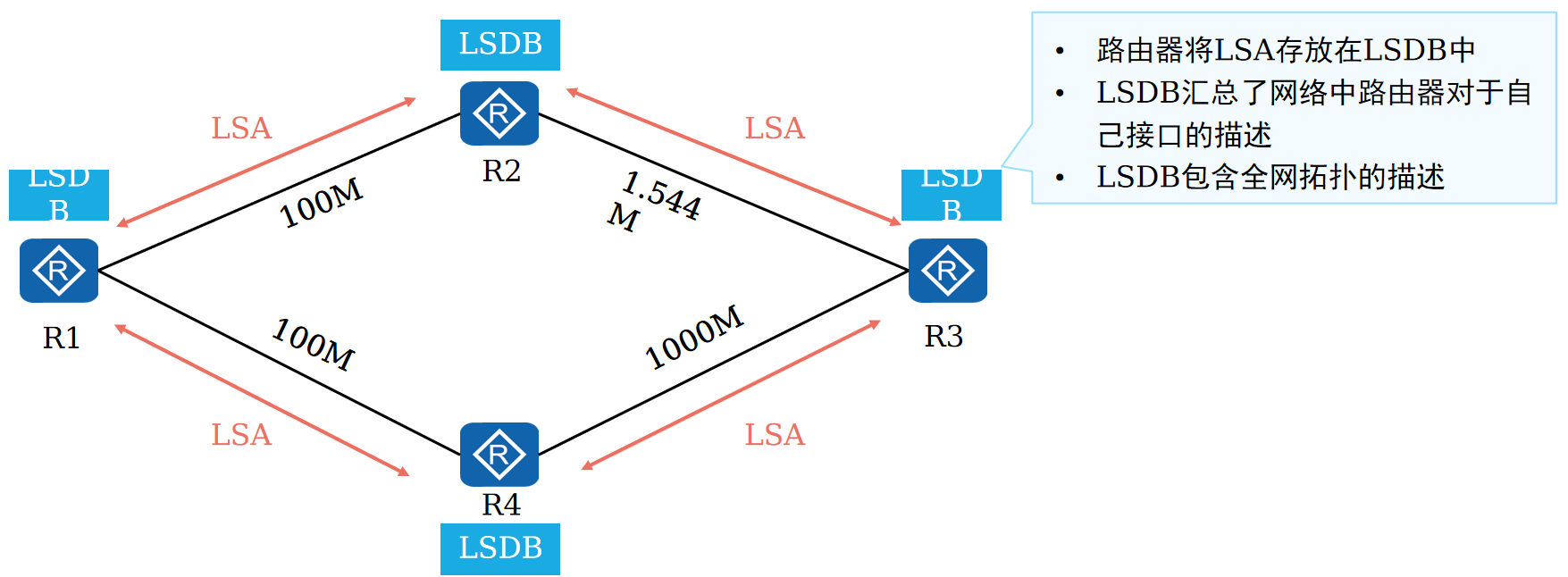 每台路由器都会产生LSA,路由器将接收到的LSA放入自己的LSDB(Link State DataBase,链路状态数据库)。路由器通过LSDB,掌握了全网的拓扑。