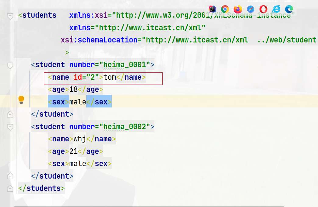 <students xmlns:xsi="http://www.w3.org/2001/XMLSchema-instance"xmlns="http://www.itcast.cn/xml" xsi:schemaLocation="http://www.itcast.cn/xml student.xsd"><student number="heima_0001"><name>tomname><age>18age><sex>malesex>student>students>