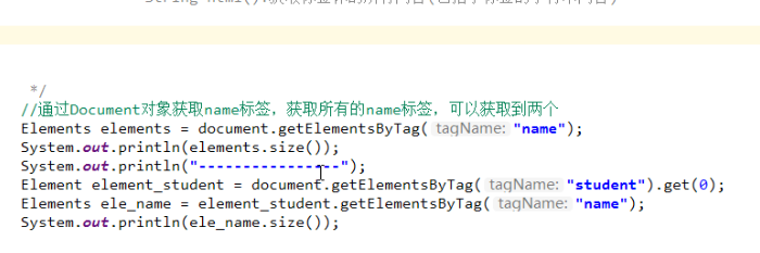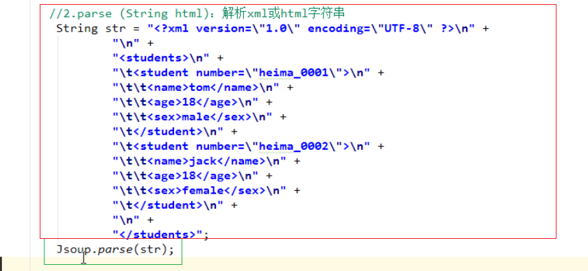 // //2.1获取xml的path路径String path = JsoupDemo1.class.getClassLoader().getResource("student.xml").getPath();Document document = Jsoup.parse(new File(path), "utf-8");//获取所有studentElements elements = document.getElementsByTag("student");System.out.println(elements);}打印结果:打印了student对象 <student number="heima_0001"> <name>tom</name> <age>18</age> <sex>male</sex>