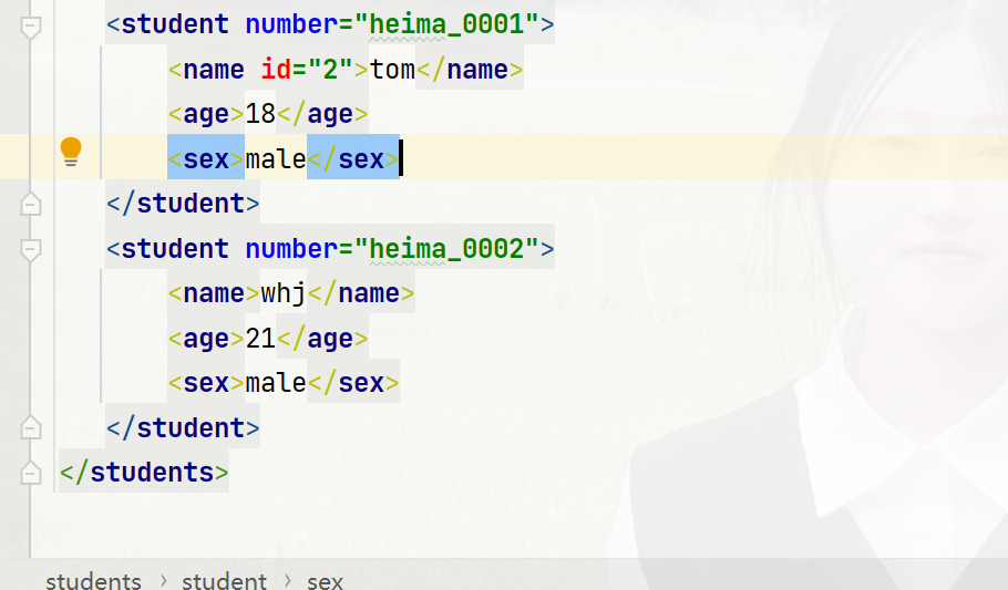 <student number="heima_0002"> <name>whj</name> <age>21</age> <sex>male</sex>