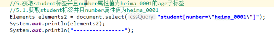 // 获取number属性值为heima_0001的元素对象Elements value = document.getElementsByAttributeValue("number", "heima_0001");System.out.println(value);}结果: