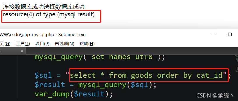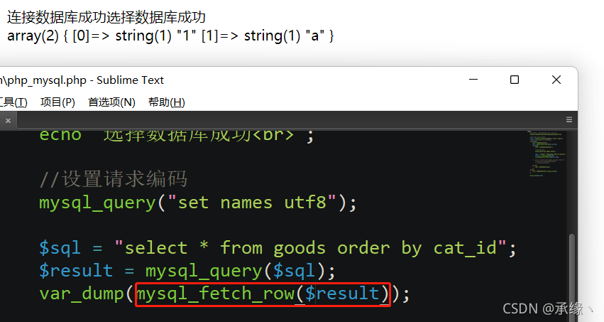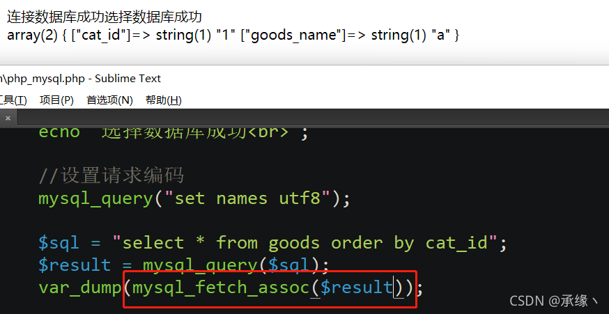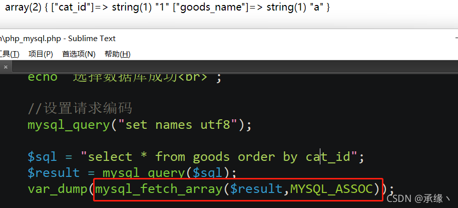 ';//设置请求编码mysql_query("set names utf8");$sql = "select * from goods order by cat_id";$result = mysql_query($sql);var_dump(mysql_fetch_array($result,MYSQL_ASSOC));}else{echo '选择数据库失败';}}else{echo '连接数据库失败'.mysql_error();} mysql_close($link);