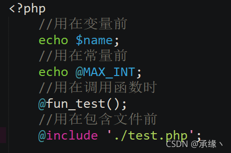 描述:用来屏蔽各种错误,可以用在变量、常量、函数调用、include甚至用在一个表达式前。但是它不能用在函数定义前,也不能用在结构语法例如for foreache、if、while等前。