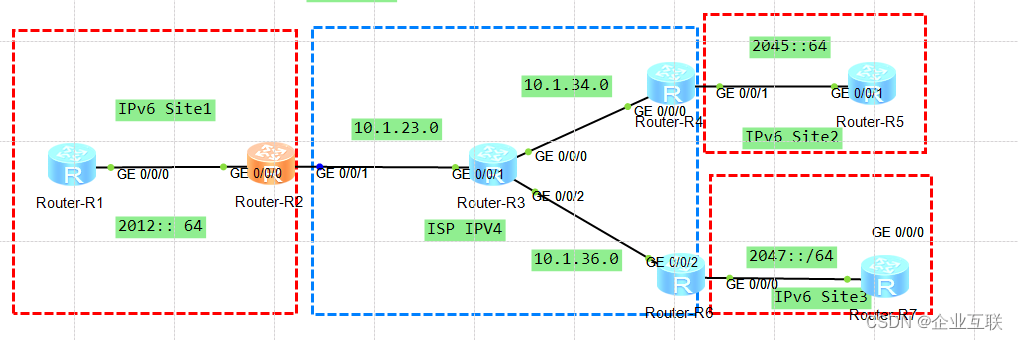 为了使二个IPV6区域互通配置IPV6,也需要配置静态路由