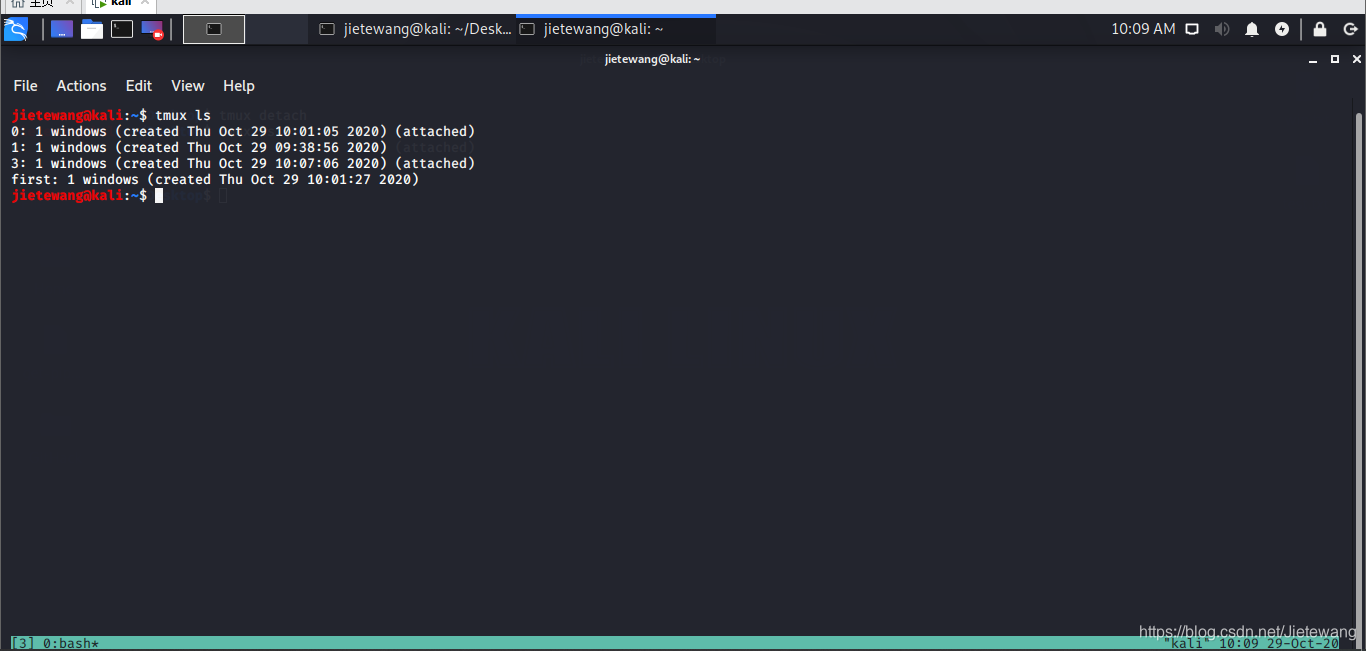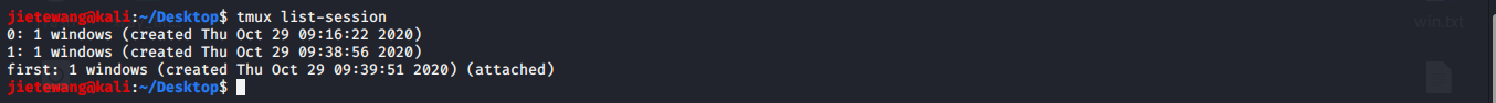 在我们需要切换会话的时候,使用命令切换会话。但是在这里需要注意的是,我们要知道那些会话是正在被人使用,查看会话状态。通过会话最后跟的(attached)判断哪一个会话正在使用,根据左下角可以判断出当前使用的哪一个会话。