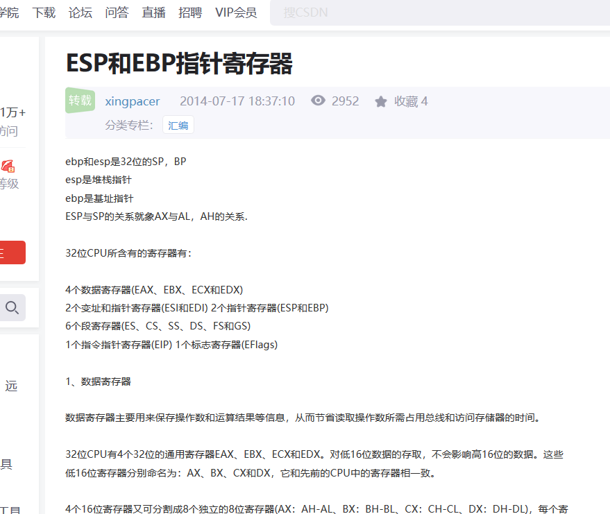- EBP(Base Pointer):基址指针寄存器,指向当前栈的栈底。
