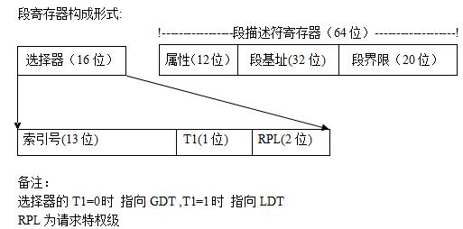 每个表项存放的是段的起始地址,(相当于之前的 段大小 * 第几段), 原来的段寄存器中存放的是选择子(Selector),他表示的含义是 段描述符表中的哪个表项。具体的原理可以看看其他的博文,这里总结下就是: