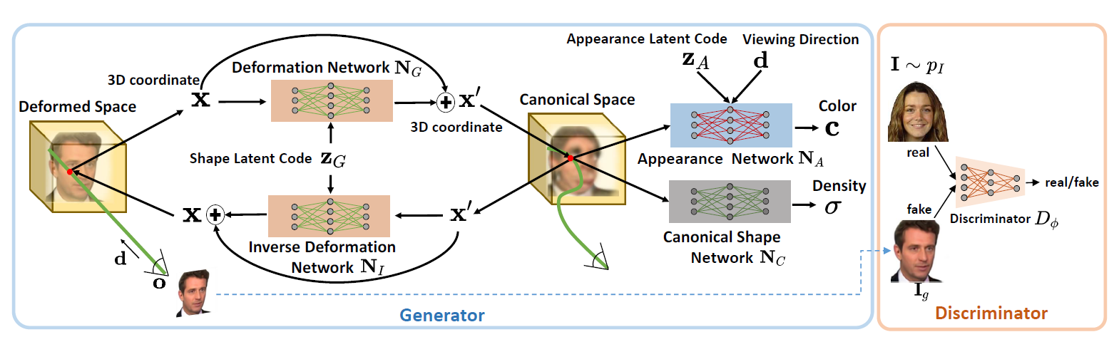 本文也是基于NeRF的一个衍生,可以看做GRAF的进阶版。主要做的工作是基于单图的3D重建,并在重建过程中将外观(光照和纹理的结合)与几何信息解耦,另外每个模型只能处理同一类物体,无法同时处理多个不同类物体。主要的思路是强行要求所有输入图像通过形变网络对应到同一个基准形状(比如平均脸),并共用同一套NeRF网络学习并进行渲染,从而解耦形状和外观。解耦的思路就是用形变场模拟形状,用基准空间模拟颜色。