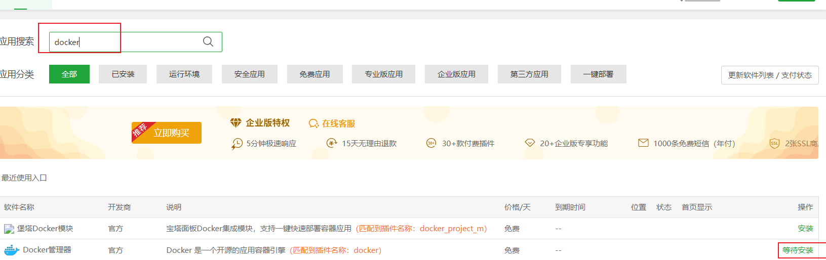 浏览器输入ip:8888/xxx(例如192.xxx.xxx.xxx:8888)登录宝塔面板后安装推荐软件Nginx、mysql等,进入软件商城安装docker管理器。