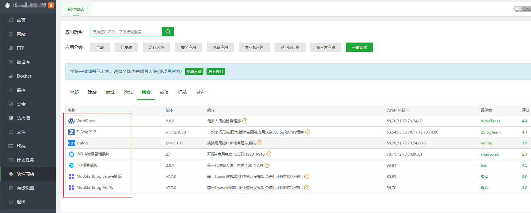 3.4 (选)使用宝塔面板一键部署个人博客、表白墙、网盘等