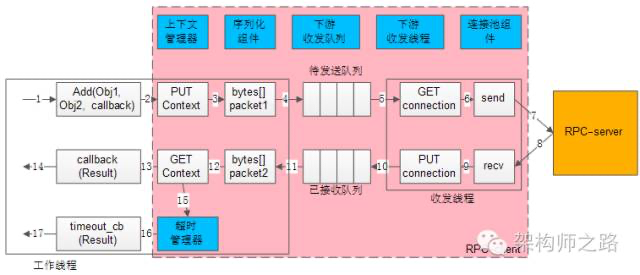 蓝色六个小框,代表了异步RPC-client六个核心组件:上下文管理器,超时管理器,序列化组件,下游收发队列,下游收发线程,连接池组件。
