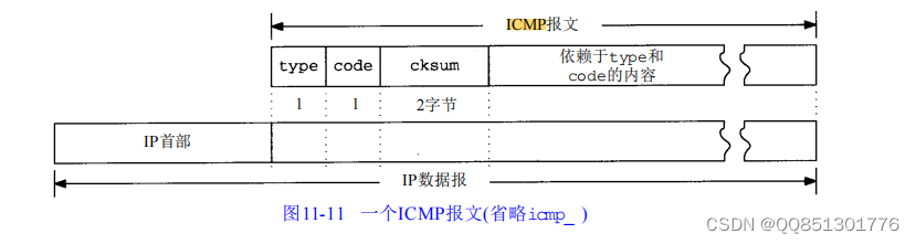 图11 - 1显示了所有目前定义的I C M P报文。双线上面的是I C M P请求和回答报文;双线下面的是I C M P差错报文。