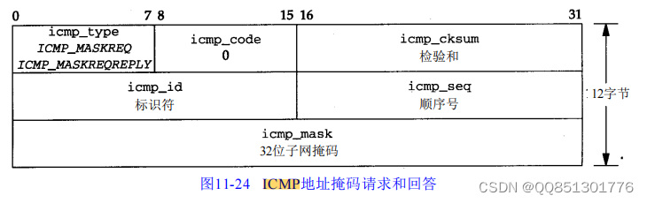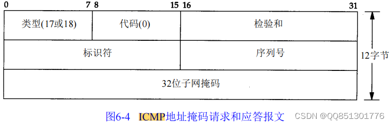 I C M P地址掩码请求用于无盘系统在引导过程中获取自己的子网掩码。系统广播它的I C M P请求报文(这一过程与无盘系统在引导过程中用 R A R P获取I P地址是类似的)。无盘系统获取子网掩码的另一个方法是 B O O T P协议,我们将在第 1 6章中介绍。 I C M P地址掩码请求和应答报文的格式如图6 - 4所示。