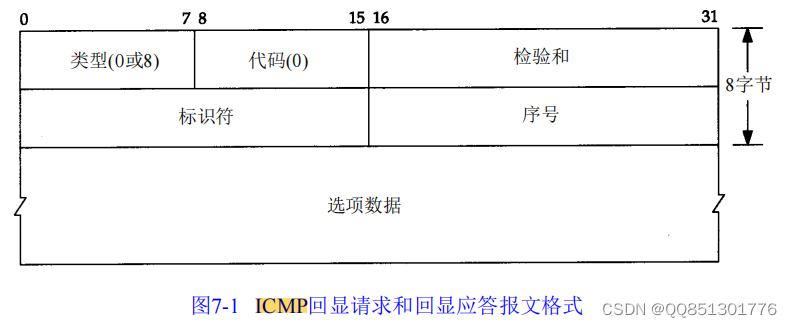 我们称发送回显请求的 p i n g程序为客户,而称被 p i n g的主机为服务器。大多数的 T C P / I P实现都在内核中直接支持 P i n g服务器—这种服务器不是一个用户进程。I C M P回显请求和回显应答报文如图 7 - 1所示。