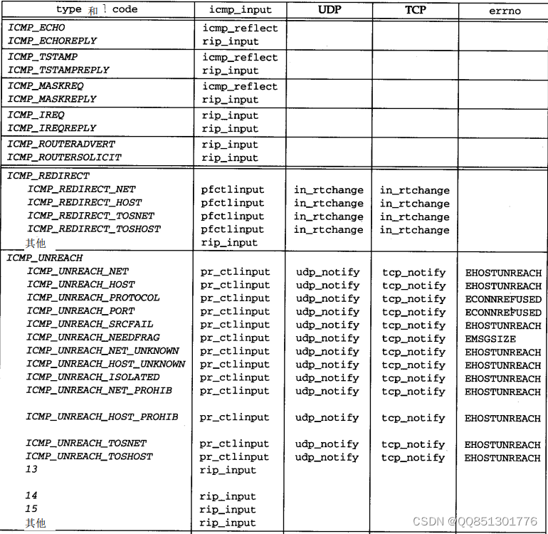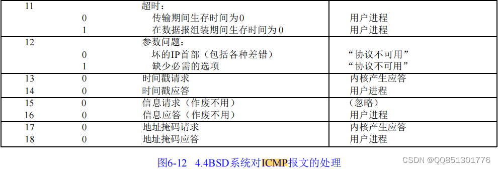 如果最后一列标明是“内核”,那么I C M P就由内核来处理。如果最后一列指明是“用户进程”,那么报文就被传送到所有在内核中登记的用户进程,以读取收到的 I C M P报文。如果不存在任何这样的用户进程,那么报文就悄悄地被丢弃(这些用户进程还会收到所有其他类型的I C M P报文的拷贝,虽然它们应该由内核来处理,当然用户进程只有在内核处理以后才能收到这些报文)。有一些报文完全被忽略。最后,如果最后一列标明的是引号内的一串字符,那么它就是对应的 U n i x差错。其中一些差错,如 T C P对发送端关闭的处理等,我们将在以后的章节中对它们进行讨论。
