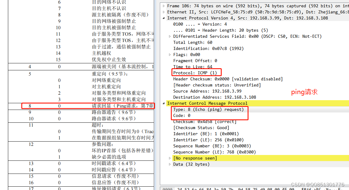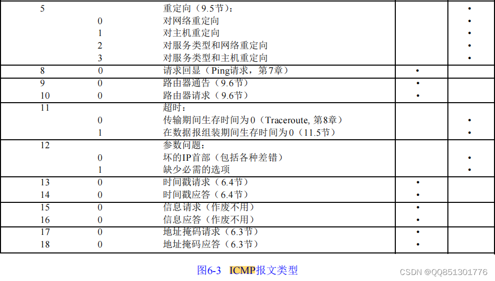 类型字段可以有15个不同的值,以描述特定类型的ICMP报文。某些ICMP报文还使用代码字段的值来进一步描述不同的条件。