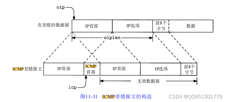 - 差错报文:I C M P差错报文通常包含了引起错误的 I P数据报的第一个分片的 I P首部(和选项),加上该分片数据部分的前 8个字节。标准假定这 8个字节包含了该分组运输层首部的所有分用信息,这样运输层协议可以向正确的进程提交 I C M P差错报文。T C P和U D P端口号在它们首部的前8个字节内出现。