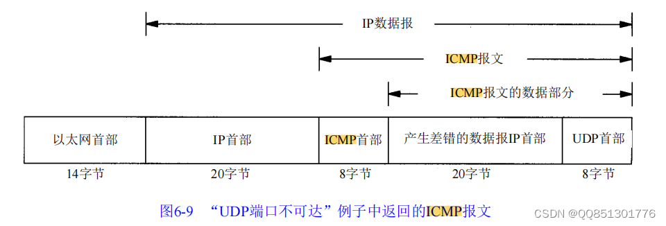 I C M P的一个规则是, I C M P差错报文(参见图 6 - 3的最后一列)必须包括生成该差错报文的数据报I P首部(包含任何选项),还必须至少包括跟在该 I P首部后面的前 8个字节。