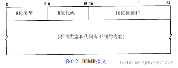 ICMP报文的格式如图6 - 2所示。所有报文的前4个字节都是一样的,但是剩下的其他字节则互不相同。