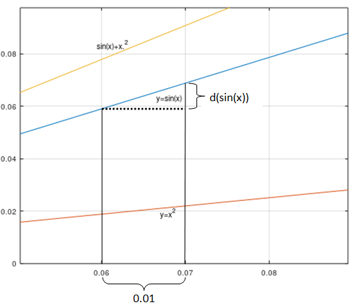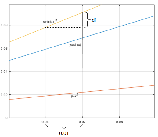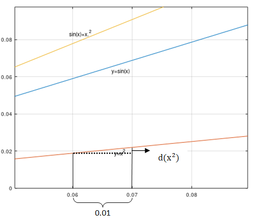 在开头前请一定要记住一个很重要的东西:dx 的增长并没有以下图例所示的那么大,一般是越接近于 0 越好,比如dx =0.0000000001 ,只是为了更加直观地查看到图形的变化,所以以下例子将其放大,很多时候变量 x 增加一丢丢意味着在公式里面可以被忽略。