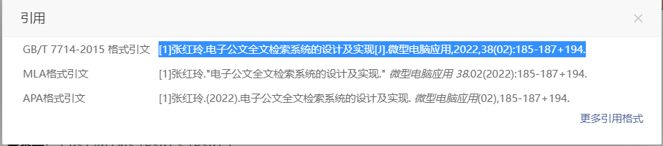 但是在论文写作中,我们不需要去手动输入参考文献,如果从中国知网等一些学术网站上引用文献,可以直接点击“引用”,选择好需要的格式,复制即可。