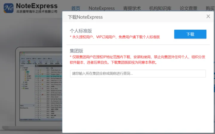打开Note Express官网,单击下载→选择集团版→选择你的学校→下载安装,安装后会在Word自动安装插件。