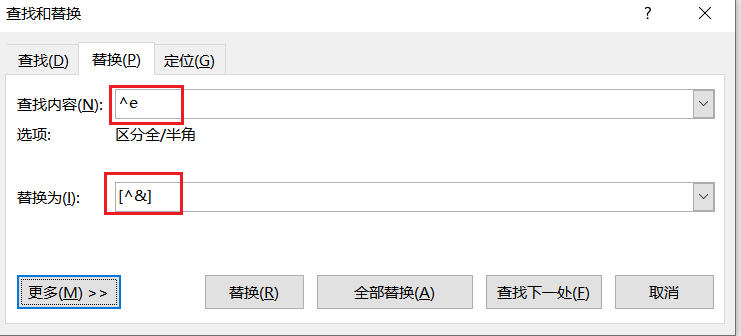 我们需要打开查找替换对话框,在查找栏输入“e”,替换栏输入“[&]”,点击【全部替换】即可。e表示尾注标记,&表示原内容,只不过加了个中括号。