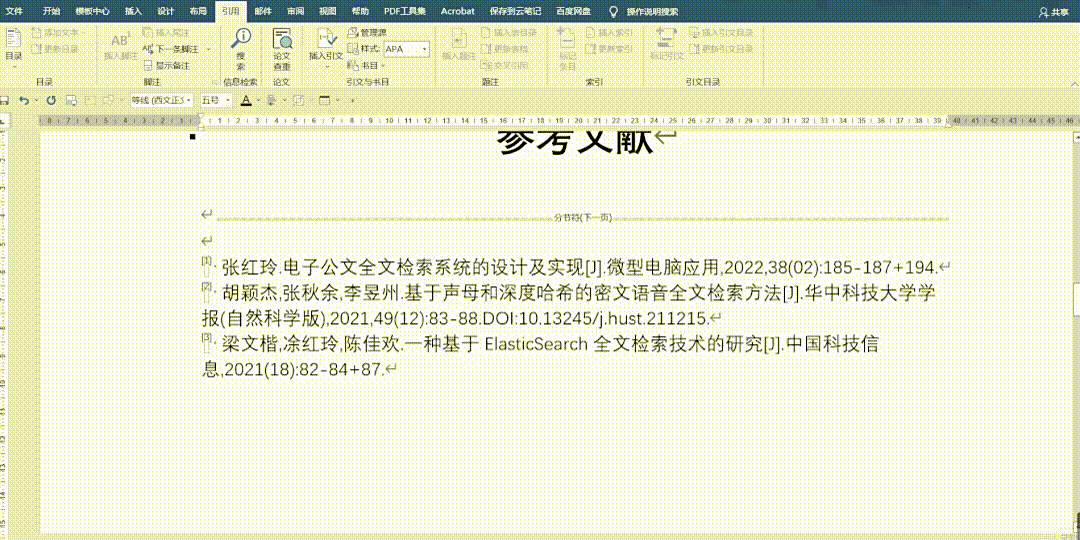 使用这种方式,不论是参考文献的插入还是删除,Word都会自动更新编号,不需要手动更新。