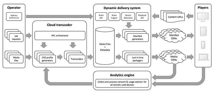 在必读的白皮书《CMAF的大规模部署》中,来自Brightcove的四位作者(包括Yuriy Reznik)概述了他们在Brightcove视频云平台上部署CMAF的愿景,其概述如图2所示。顾名思义,视频云是一个基于云的系统,它包含多个组件,比如上下文感知编码,以及一个动态交付系统,该系统管理传输、打包、加密以及将内容交付到CDN。