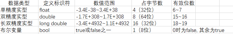 C++语言支持三种实型,它们是float(单精度实型)、double(双精度实型)、long double(长双精度实型)。每一种类型规定了相应的实数取值范围、所使用的存储空间(字节数)以及能达到的精度(有效位数)。float 在空间允许的情况下没有必要使用,都应使用double提高精度。
