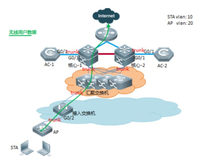 ap就是这样,经常能在天花板、墙面上看到,看不到地方是1根网线连接到交换机,下图为典型的wlan项目拓扑图,可以看到整体的架构。