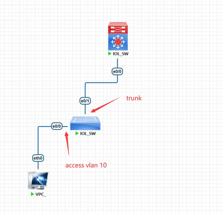 拓扑图如上,这里交换机IOL_SW的e0/0口为vlan 10的access接口,e0/1口为trunk接口,默认情况下,经过trunk的数据包,都是携带标签的。