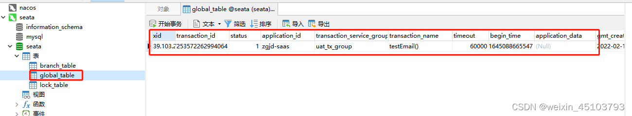 ) ENGINE = InnoDB CHARACTER SET = utf8 COLLATE = utf8_general_ci COMMENT = '存储锁表' ROW_FORMAT = Dynamic;CREATE TABLE `global_table` (`xid` varchar(128) CHARACTER SET utf8 COLLATE utf8_general_ci NOT NULL,`transaction_id` bigint(20) NULL DEFAULT NULL,`status` tinyint(4) NOT NULL,`application_id` varchar(32) CHARACTER SET utf8 COLLATE utf8_general_ci NULL DEFAULT NULL,`transaction_service_group` varchar(32) CHARACTER SET utf8 COLLATE utf8_general_ci NULL DEFAULT NULL,`transaction_name` varchar(128) CHARACTER SET utf8 COLLATE utf8_general_ci NULL DEFAULT NULL,`timeout` int(11) NULL DEFAULT NULL,`begin_time` bigint(20) NULL DEFAULT NULL,`application_data` varchar(2000) CHARACTER SET utf8 COLLATE utf8_general_ci NULL DEFAULT NULL,`gmt_create` datetime(0) NULL DEFAULT NULL,`gmt_modified` datetime(0) NULL DEFAULT NULL,PRIMARY KEY (`xid`) USING BTREE,INDEX `idx_gmt_modified_status`(`gmt_modified`, `status`) USING BTREE,INDEX `idx_transaction_id`(`transaction_id`) USING BTREE