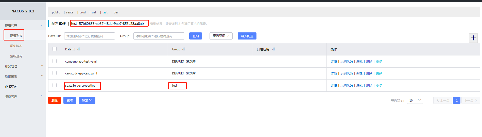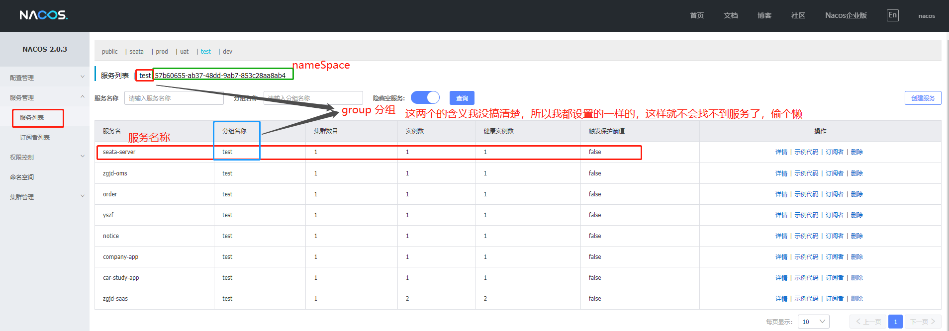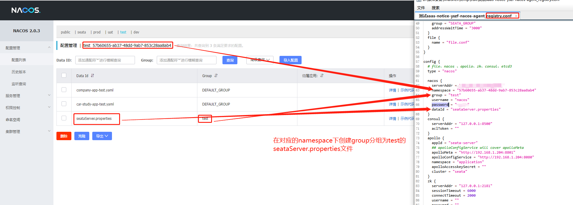 上面所有配置总结意思为:从nacos中 分组group = "test" ; 命名空间namespace = "57b60655-ab37-48dd-9ab7-853c28aa8ab4" seataServer.properties 文件中读取配置