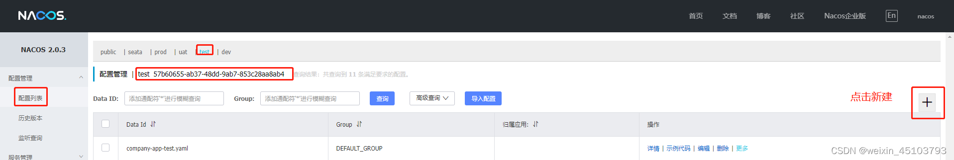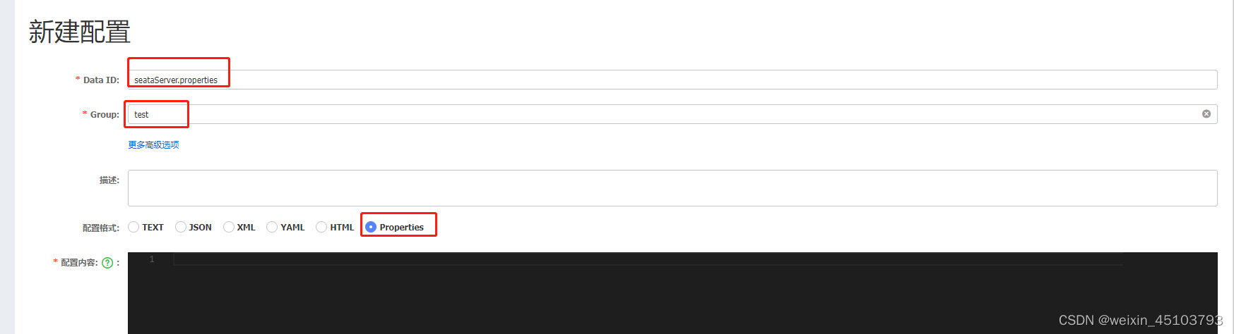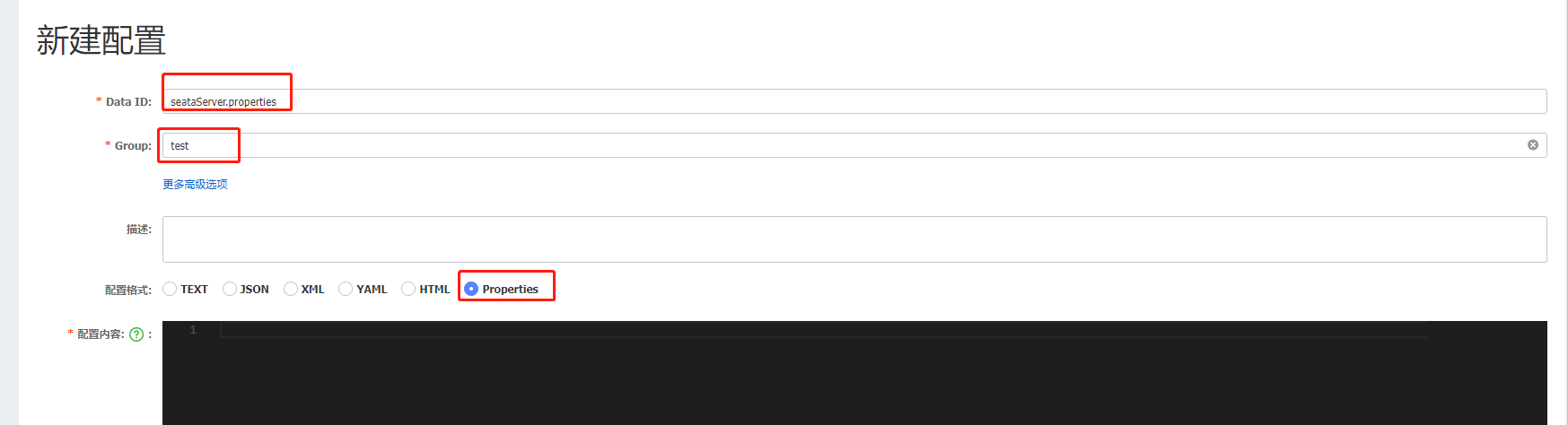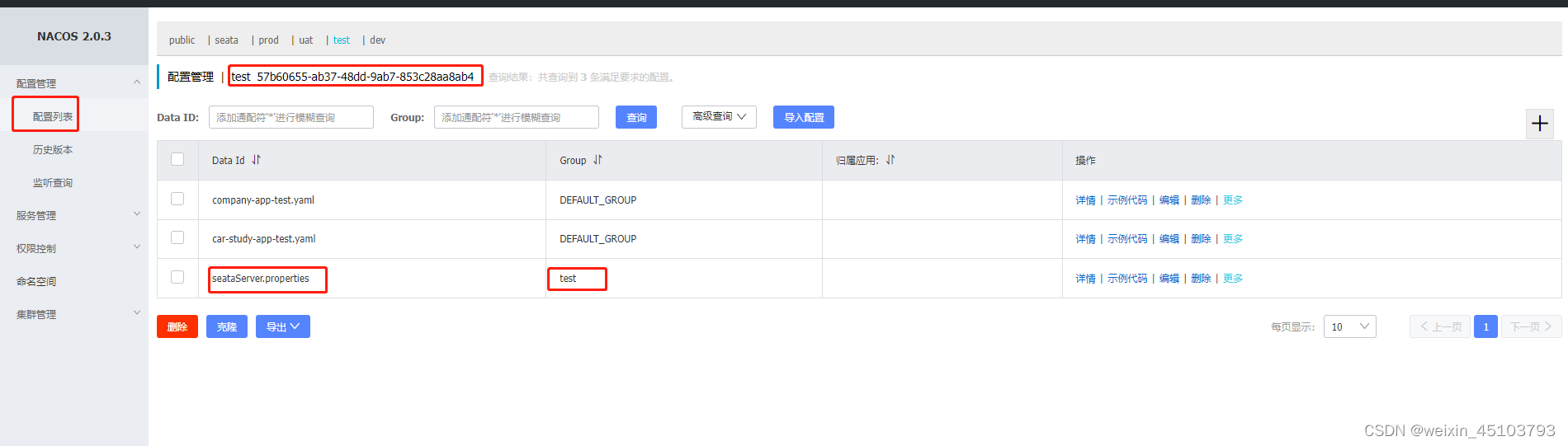 上面所有配置总结意思为:从nacos中 分组group = "test" ; 命名空间namespace = "57b60655-ab37-48dd-9ab7-853c28aa8ab4" seataServer.properties 文件中读取配置