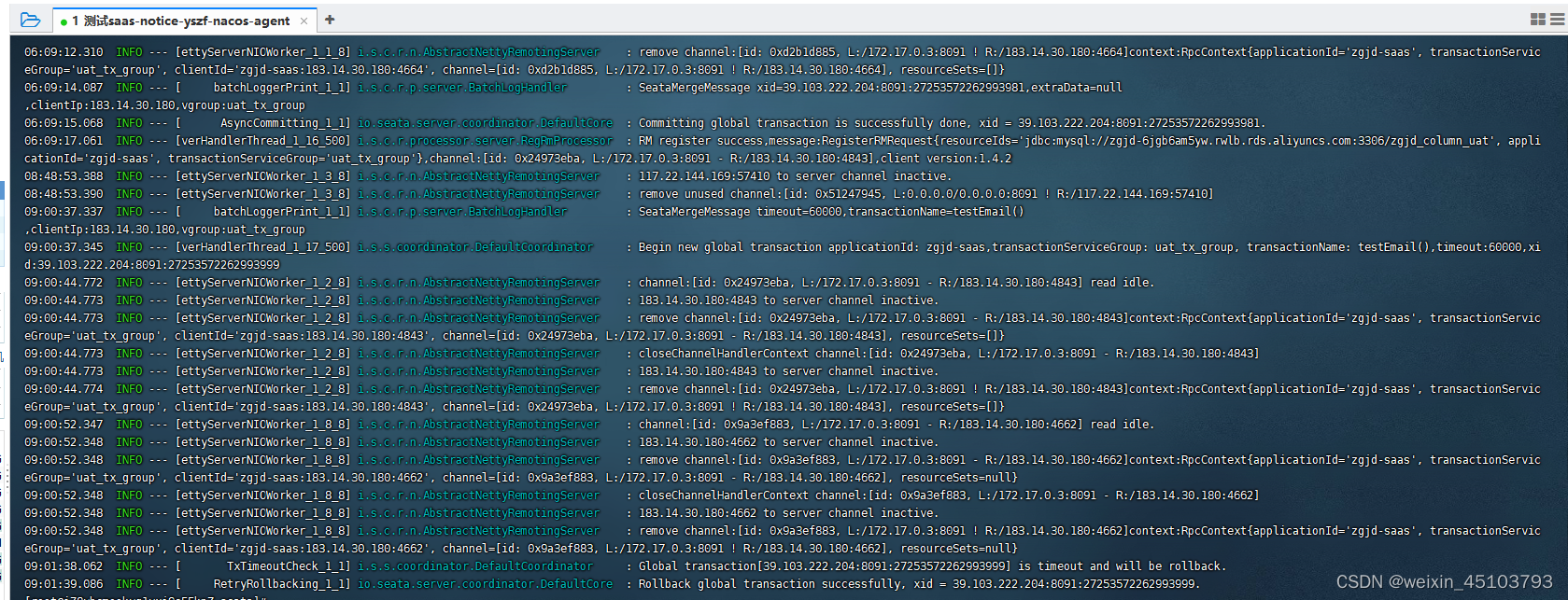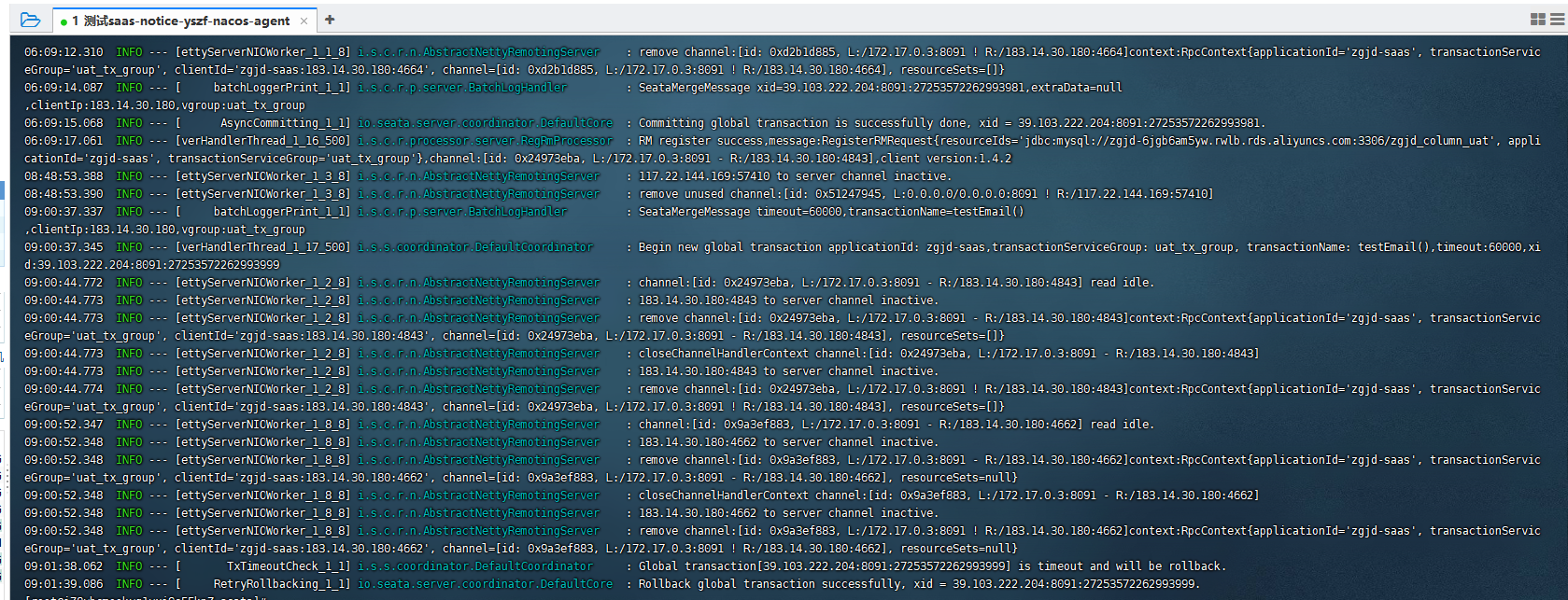 seata.service.vgroupMapping.default_tx_group: default seata.tx-service-group: default_tx_group 必须是一个值如果uat环境可以更改值--前提必须 seataServer.properties 文件内有这个值(8.3步骤后面红色说明!) seata.service.vgroupMapping.uat_tx_group: default seata.tx-service-group: uat_tx_group