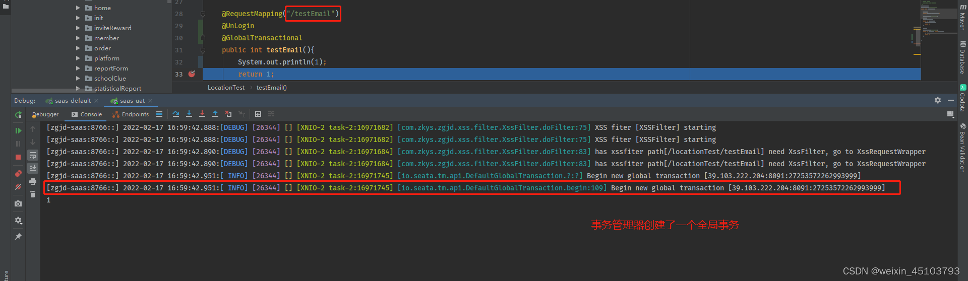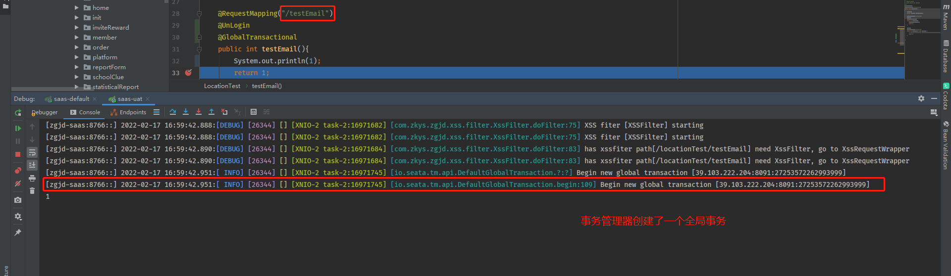 public class LocationTest {@RequestMapping("/testEmail")@UnLogin@GlobalTransactionalpublic int testEmail() {System.out.println(1);return 1;}}