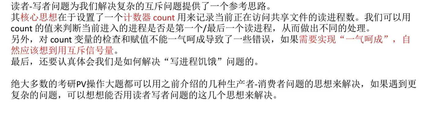 - 比如:当count=0时,第一个读者进程执行到p(rw),rw=0,假设此时时间片到了,切换到第二个读者进程,第二个进程发现count=0,则执行p(rw),但是此时rw=0,于是第二个进程被堵在p(rw)这里,同理,后面的可能会有多个进程堵在p(rw),只有当第一个进程再次获得时间片,执行count++,让count不为0,然后其他进程就可以直接绕过if直接进行count++来访问文件,但是第三个读者进程和后面的几个可能堵在p(rw)的多个读者进程则必须得等count–为0后才可以再次和写进程竞争来访问文件,对count的访问没有做到一气呵成,会导致本来一些进程一直堵在p(rw)。