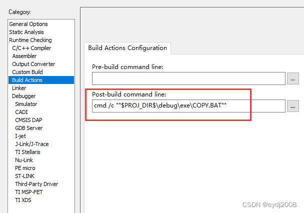 将刚刚那个批处理文件 改名为 copy.bat, 然后IAR就可以直接将生成的BIN文件复制并改名了。