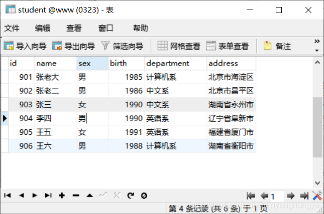 INSERT INTO student VALUES( 906,'王六', '男',1988,'计算机系', '湖南省衡阳市');