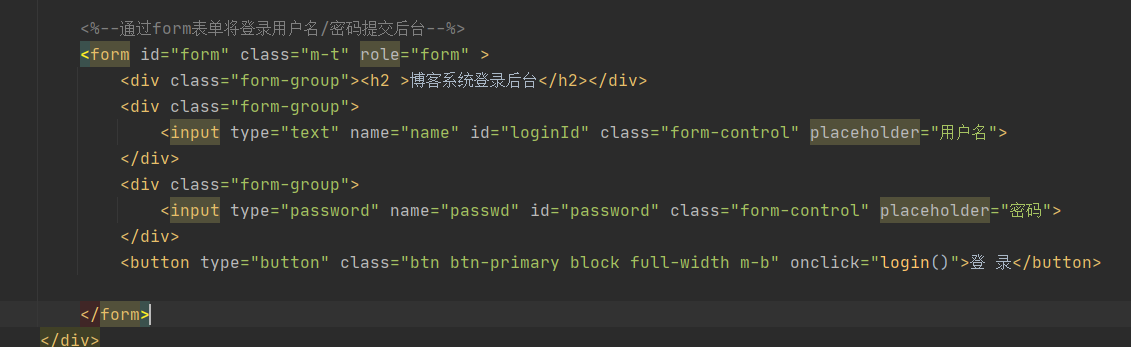 前端页面通过form表单收集用户名以及密码,点击登录按钮后,调转至js中的login()方法进行处理。