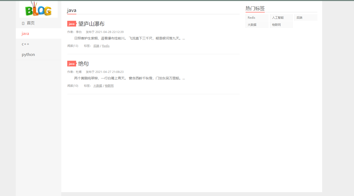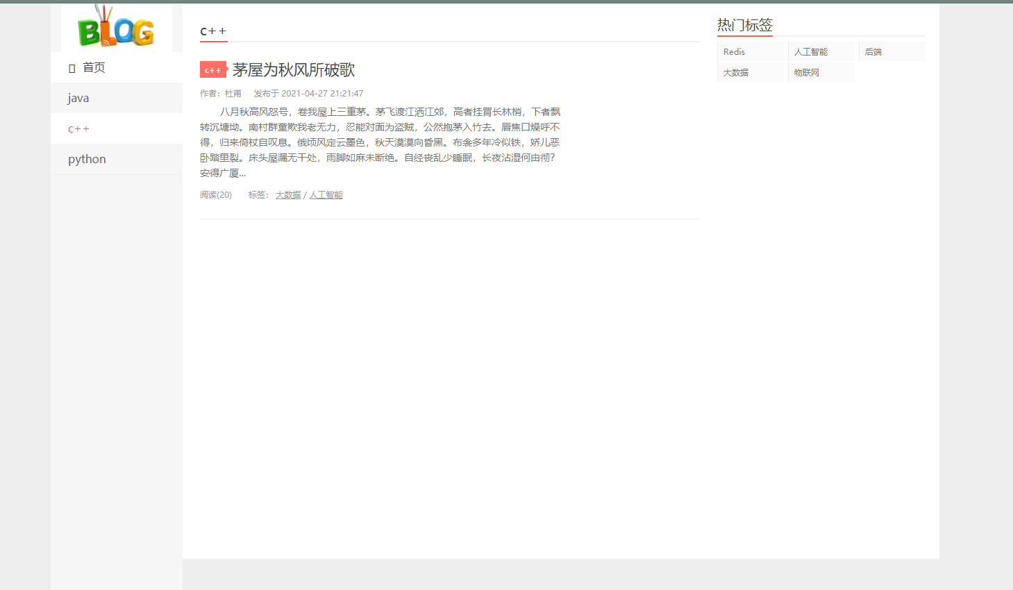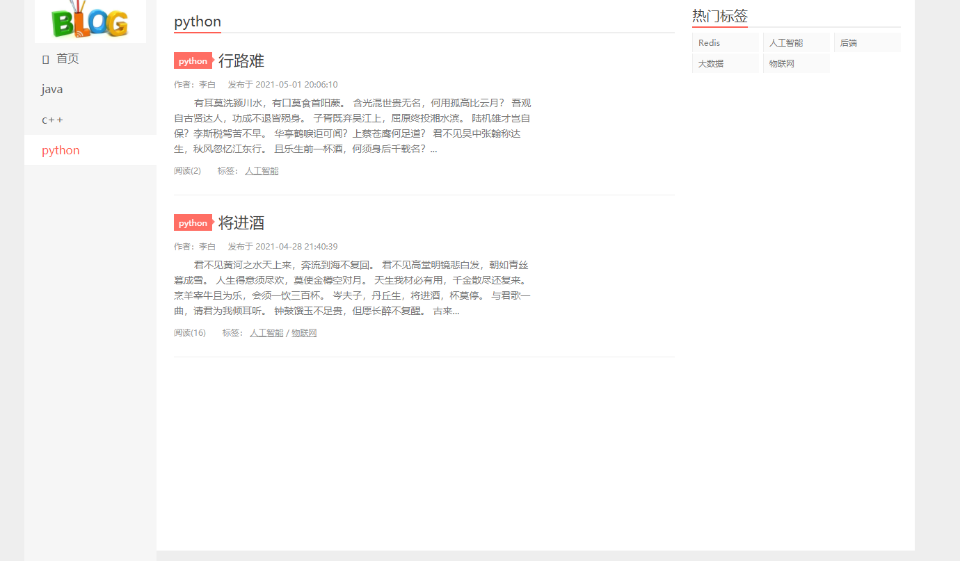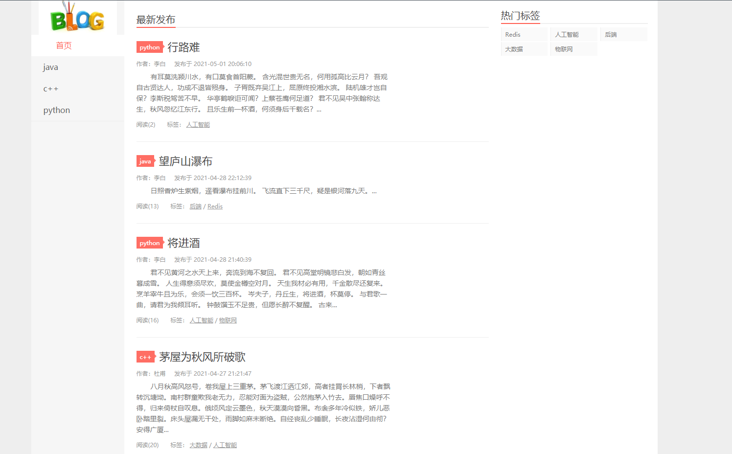 前面设计了博客的新增功能,数据库存储功能,以及登录验证功能,接下来需要在前端界面将存储到数据库中的博文信息进行展示,浏览,分类查询等,如下。