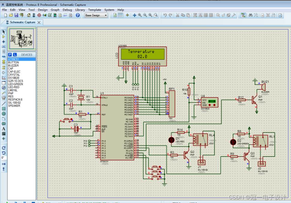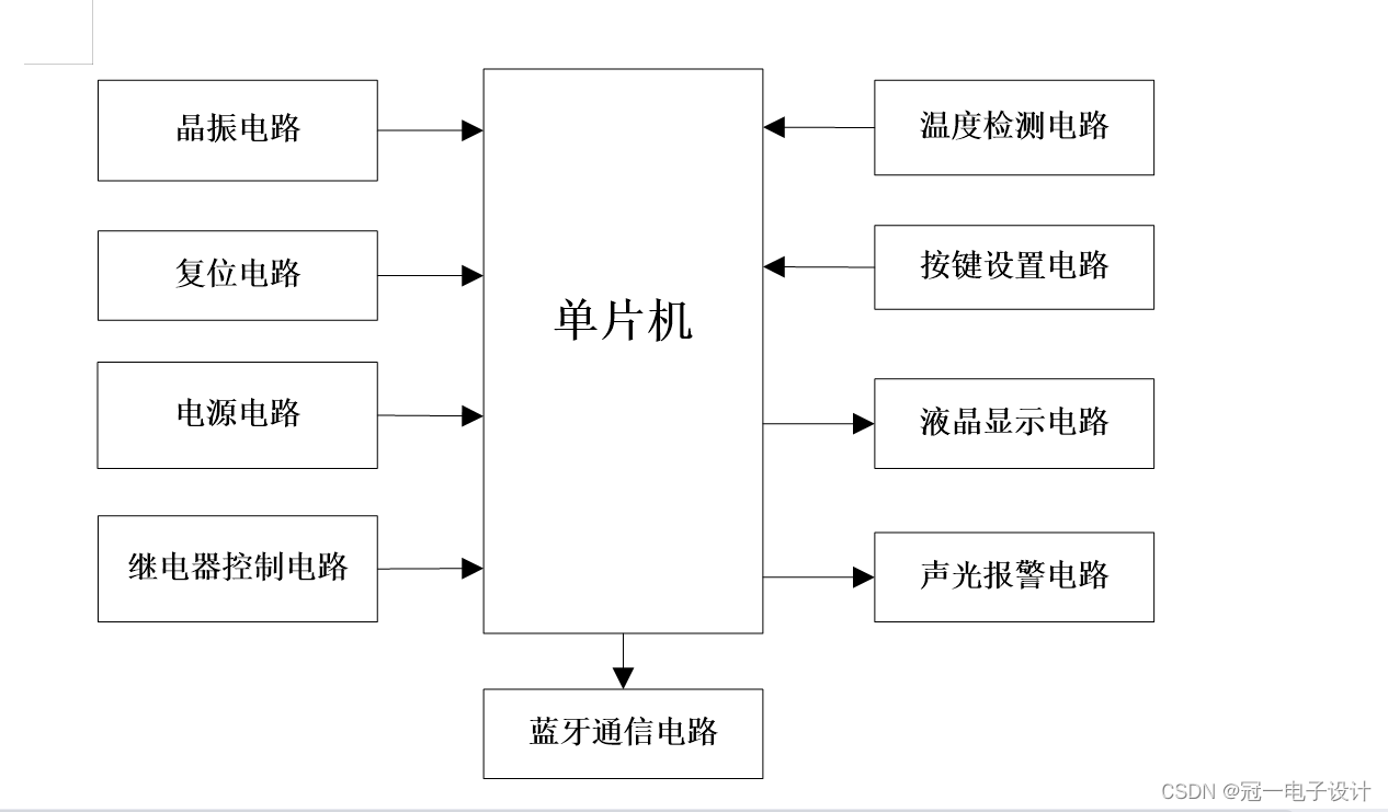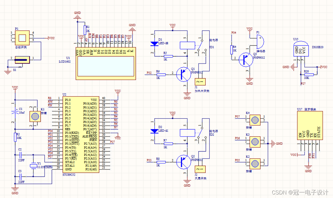 本系统采用51单片机最小系统电路(复位电路+晶振时钟电路+单片机电源电路)+DS18B20温度传感器+ LCD1602显示屏+蓝牙模块(HC-05)+独立按键+继电器+LED指示灯+蜂鸣器设计而成。