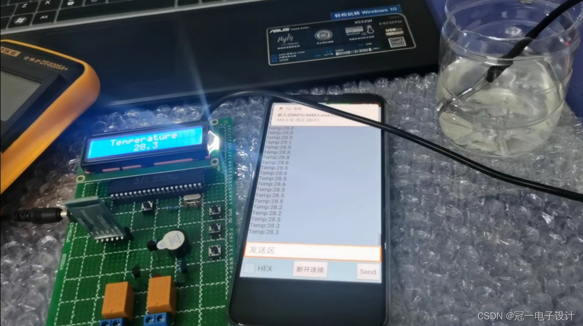 2、系统可检测当前环境的温度,通过LCD1602显示,手机APP通过蓝牙功能与系统进行连接之后,系统可通过蓝牙模块将温度数据发送至手机APP并显示。