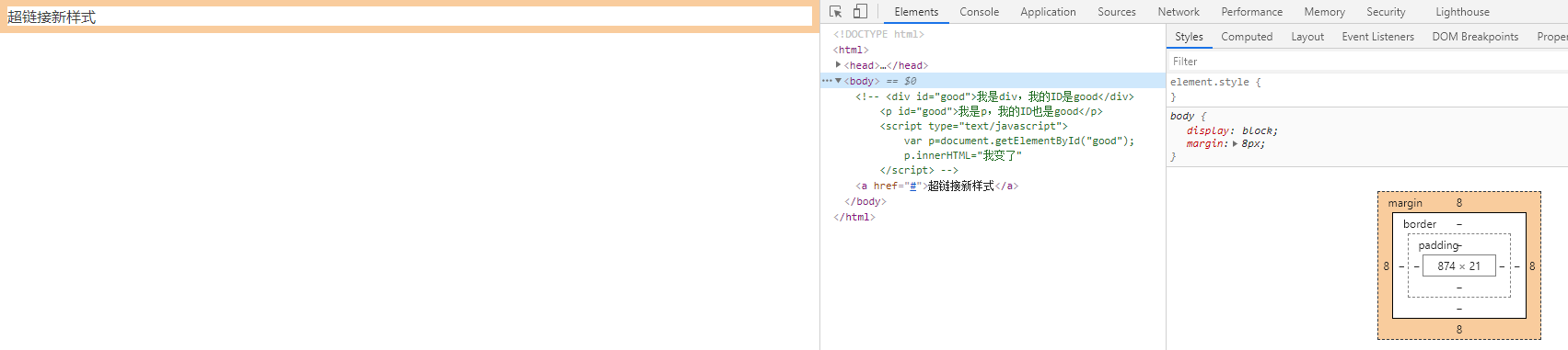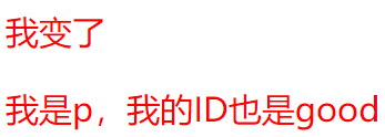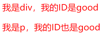 但说id选择器唯一确定某个元素也不太准确。对于CSS而言,若在HTML代码中为两个元素赋了相同的id,在CSS应用id选择器时,其实是可以将两个元素同时选择出来的,如下文中HTML代码所示,在body中声明了一个div和一个p标签,两者的id都设置为”good“。然后应用上文相同的CSS代码,选中id为good的元素,将其字体颜色设置为红色,字体大小设置为30px,得到的结果如图1所示。图中div和p标签的元素内容都发生了相应的变化,因此CSS其实是可以作用在相同id的多个元素上的。
