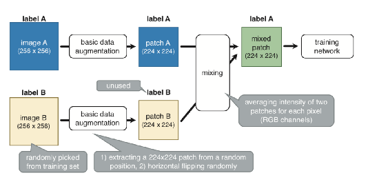 算法:训练集随机抽取的两幅图像叠加合成一个新的样本(像素取平均值),使用第一幅图像的label作为合成图像的正确label,训练集规模从 N 扩增到 N*N。