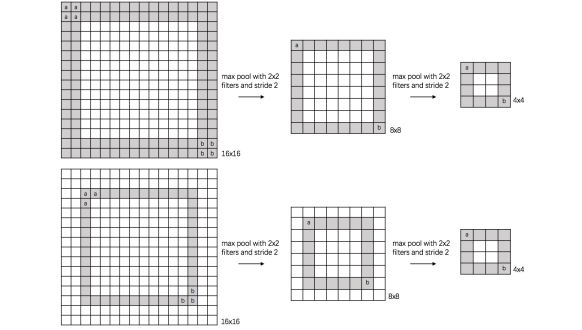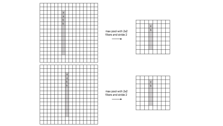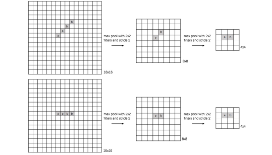 这里举一个直观的例子(数字识别),假设有一个16x16的图片,里面有个数字1,我们需要识别出来,这个数字1可能写的偏左一点(图1),这个数字1可能偏右一点(图2),图1到图2相当于向右平移了一个单位,但是图1和图2经过max pooling之后它们都变成了相同的8x8特征矩阵,主要的特征我们捕获到了,同时又将问题的规模从16x16降到了8x8,而且具有平移不变性的特点。图中的a(或b)表示,在原始图片中的这些a(或b)位置,最终都会映射到相同的位置。