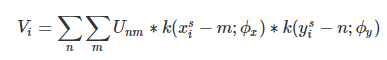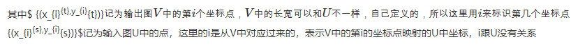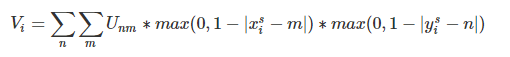 其中n和m会遍历原图U的所有坐标点,Unm指原图U中某个点的像素值,k()为取样核,两个ϕ为参数,(xsi,ysi)表示V中第i个点要到U图中找的对应点的坐标,表示的坐标是U图上的,k表示使用不同的方法来填充,通常会使用双线性插值,则会得到下面的公式