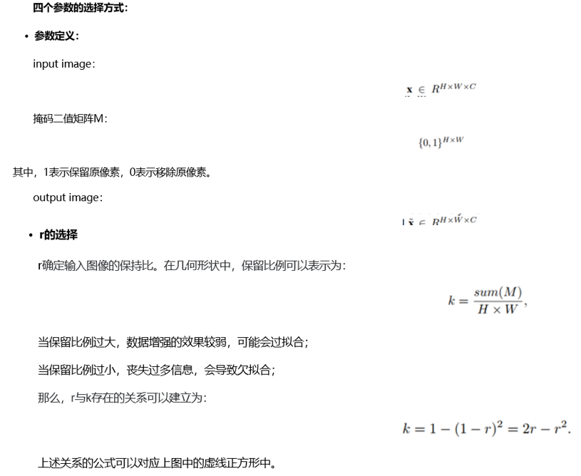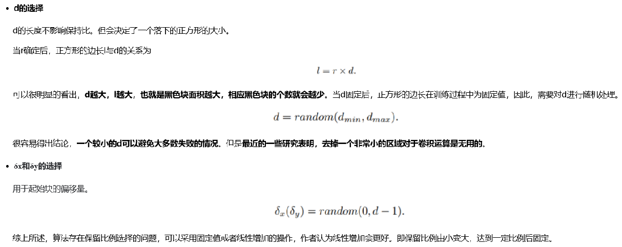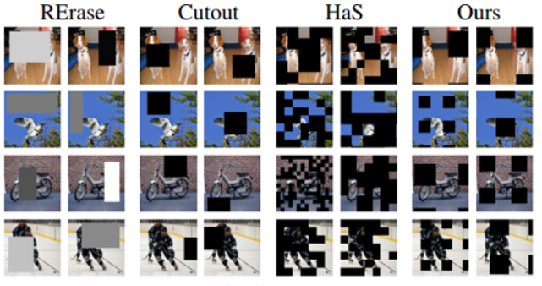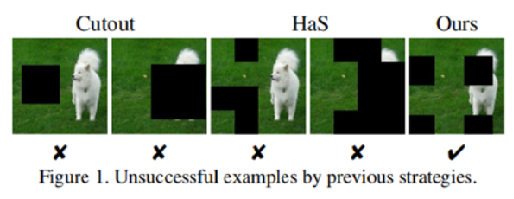 目的: 为了避免连续区域的过度删除和保留的问题,即在 删除和保留图像上的区域信息之间达到合理的平衡, Cutout,Hide-and-Seek中依概率对划分区域进行隐 藏,很有可能造成目标全部删除或者全部保留的现 象。